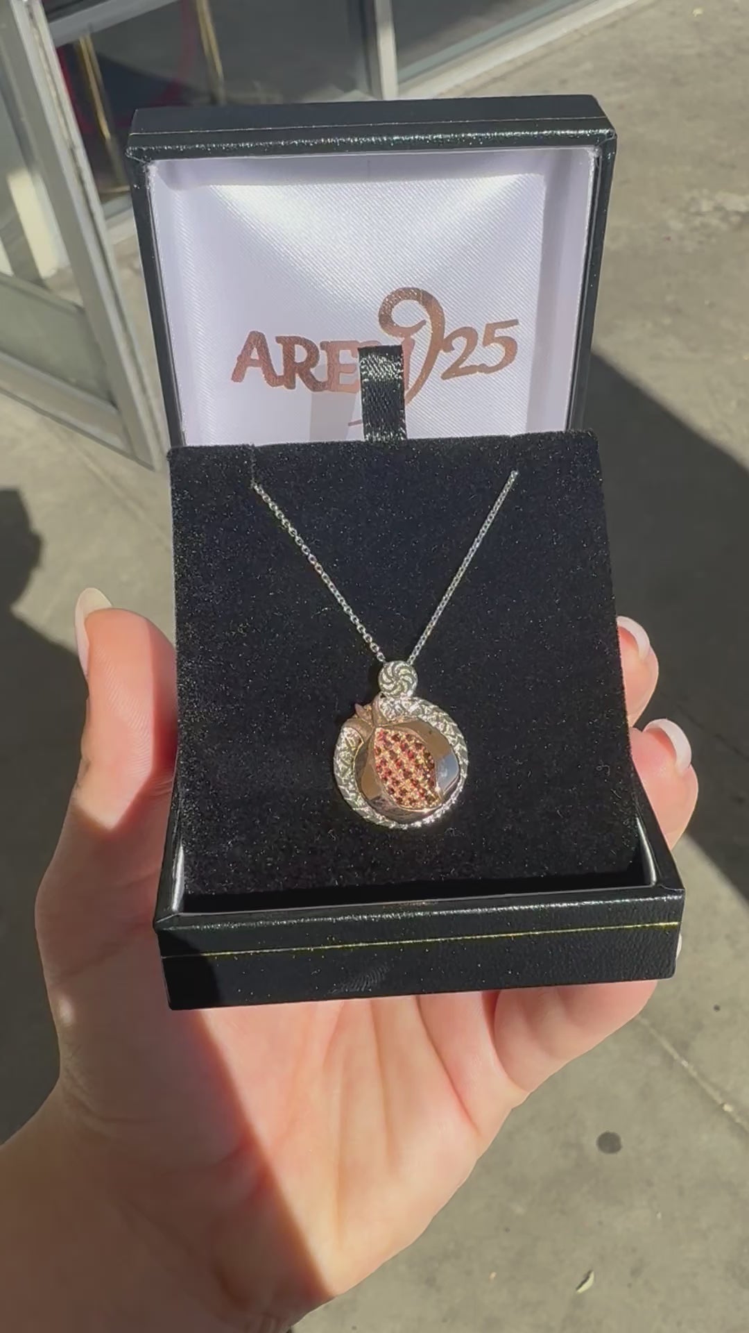 Introducing our exquisite two-tone flat pomegranate necklace, a stunning piece of jewelry that combines elegance and symbolism. Crafted with meticulous attention to detail, this necklace features a pendant in the shape of a pomegranate fruit, designed to lie flat against the chest for a sleek and sophisticated look. The pomegranate, being the symbol of good fortune and abundance is the perfect gift for anyone.