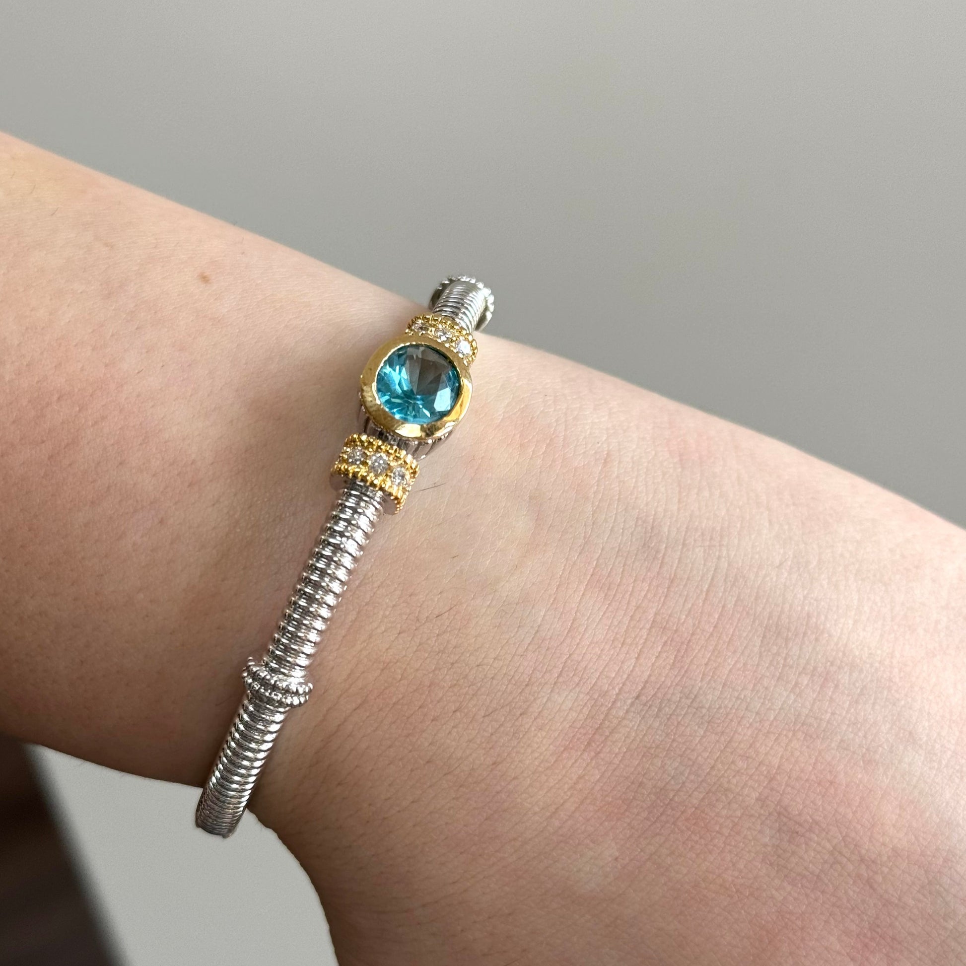 Introducing our stunning silver bracelet adorned with a captivating light blue stone, a true embodiment of elegance and charm. At the center of this exquisite piece, a mesmerizing light blue stone takes the spotlight. The stone, carefully selected for its captivating hue, radiates a soft and ethereal glow. Its light blue color evokes a sense of tranquility and serenity, adding a touch of peacefulness to your ensemble.